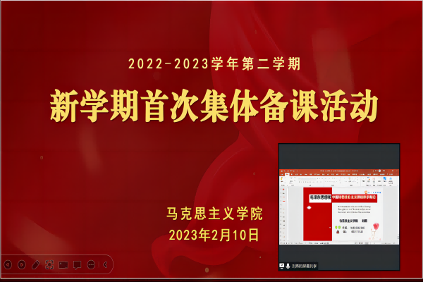 为推动党的二十大精神进教材、进课堂、进头脑,根据学校《关于上好2022-2023第二学期“开学第一课”的通知》要求,2月10日下午,马克思主义理论教研室通过线上线下相结合的方式举行《毛泽东思想和中国特色社会主义理论体系概论》课集体备活动,yl23455永利集团教学科人员及全体专兼职授课教师参加。