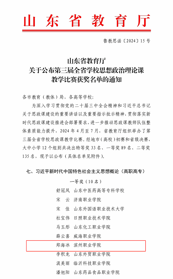 8月26日,山东省教育厅公布了第三届全省学校思想政治理论课教学比赛获奖名单,我校yl23455永利集团教师郑海冰荣获“习近平新时代中国特色社会主义思想概论(高职高专组)”一等奖。