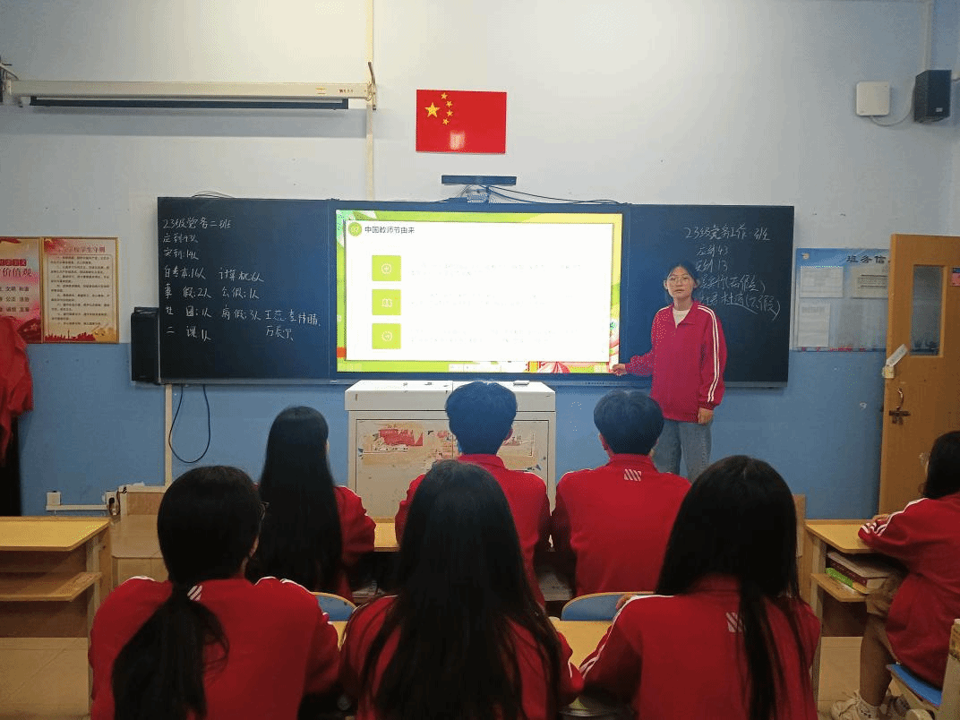 活动分为三个环节,一是讲述教师节历史,各班团支书带领各团员青年共同学习了“教师”一词的演变,深刻了解到时代赋予“教师”一词的重大意义;二是了解教师节对于社会的影响,为同学们介绍身边优秀教师的真实故事,例如全国教书育人楷模张桂梅,让同学们领悟楷模为人师表、无私奉献的精神;三是培育同学们的感恩之心,鼓励同学们通过发祝福等合理的方式向自己的任课老师们致以节日真挚的祝福,同学们纷纷表示,会在今后的学习生活中尊重教师、理解教师。